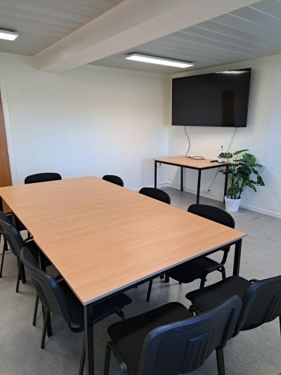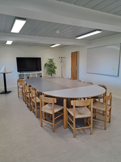 Lokalet er udstyret med en stor TV-skærm, der via VGA-stik eller HDMI-stik kan kobles til bærbar PC.